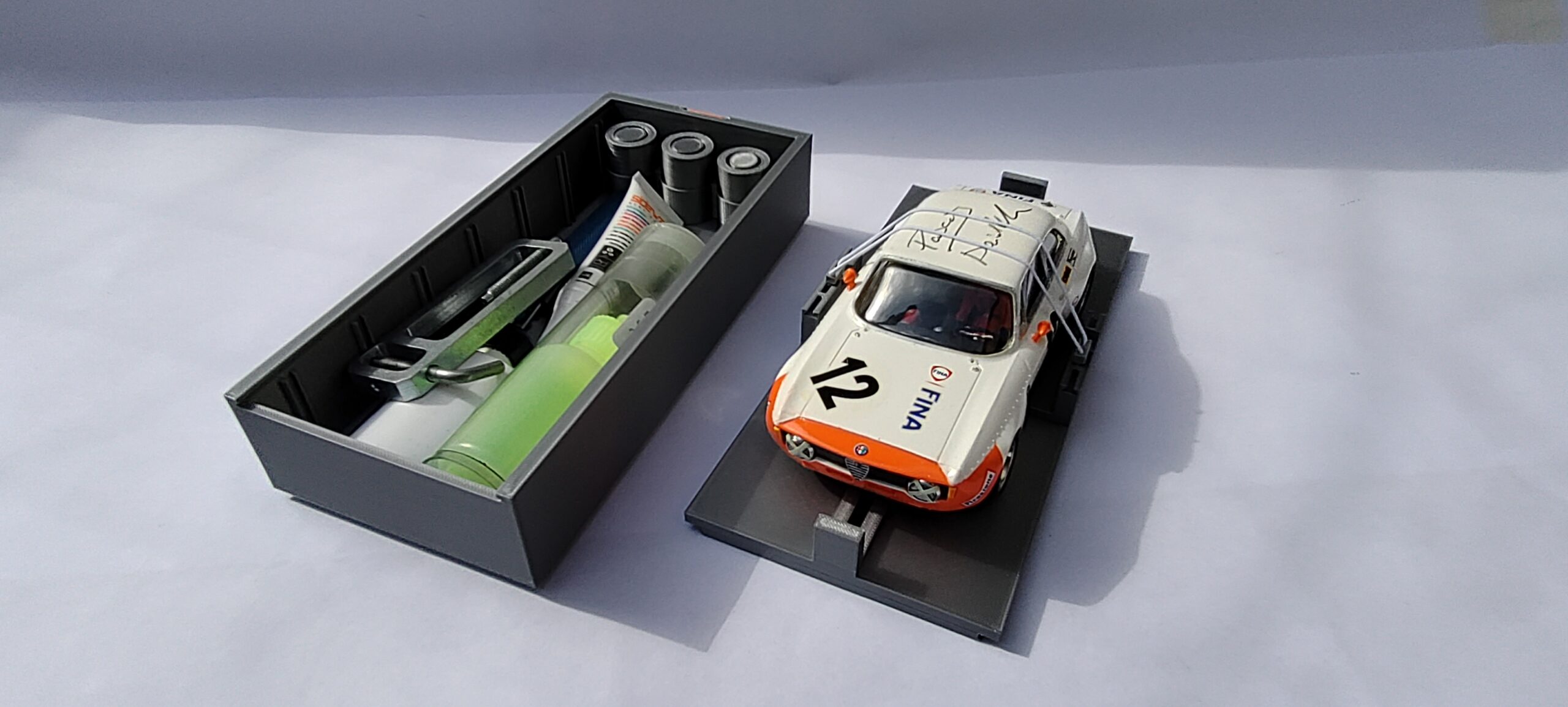 Les boites essentielles sont composées d’une sous boite de rangement et d’un couvercle aménagé pour recevoir directement votre voiture. Comme dans les boites pour voiture, la voiture repose bien à plat sur son châssis. Cela permet d’éviter les déformations de planéité qui pourraient compromettre vos performances. Les pneus ne touchent pas la surface, garantissant le maintien de forme: pas de plat à long terme.