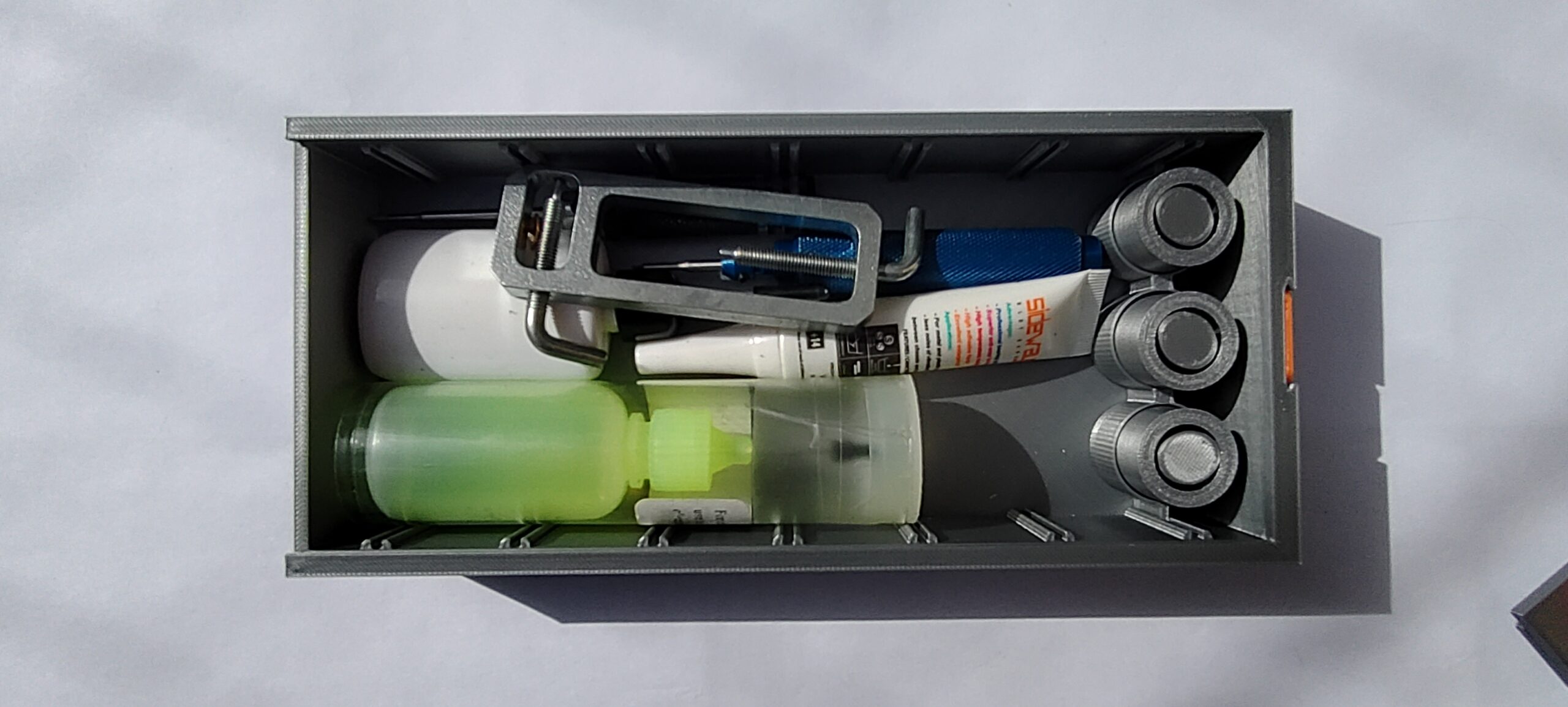 Le revers du capot est équipé d’une fente qui permet de l’utiliser comme un marbre. Les cloison de la sous boite permettent de stabiliser l’ensemble